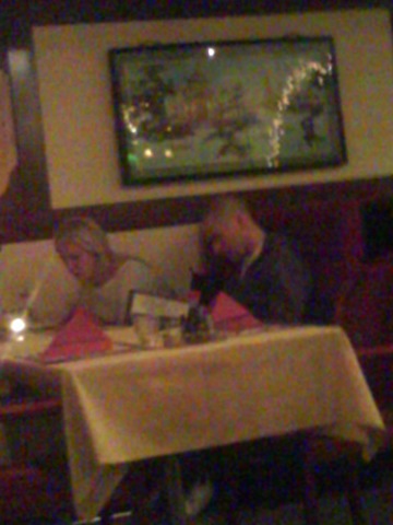 ...efter showen så blev det middag. Denna gång på Tatung där det faktiskt var alldeles lagom med folk sent en lördagkväll. Vilka enorma portioner - hur ska man få i sig all den maten hade dom tänkt! Bra portion till Johan i och för sig, men han orkade inte ens äta upp mina rester...då är det mycket (det vet alla som känner min sambo)! Hehehe...det fanns väl flera orsaker till att det var svårt att äta.. precis när vi fått maten så kommer nämligen Betnér och co. dit och sätter sig vid bordet bredvid oss... snacka om att man blev en nervöst fnittrande fjortis...hihi! Fram med mobilen och smyg-ta bilder! Jäkla dålig belysning och skitkamera säger jag bara - men ser ju inte ens vem det är ju! Men vilken kväll!