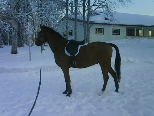 Emilia bor låångt uppe vid svensk-finska gränsen. Vi träffades i Härnösand där jag hämtade Lucky (hennes häst). Fina, fina Lucky. Jag kan fortfarande inte se honom som ridskolehäst. Han är alldeles för känslig, men otroligt väluppfostrad så han är en dröm att hålla på med. Jag drömmer fortfarande om att kunna köpa tillbaka honom från Härnösands Ridklubb där han står nu. Nåväl, jag följer Emilias blogg och NÄR SOM HELST så får hon en liten bebis! Spännande...