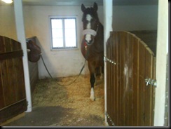 Glada nyheter, så jag tänkte att då måste jag ju provrida också och se hur det har gått med den halta damen. Ut på ridbanan kom vi, satte mig upp och sktirrade några steg... ingenting. Sist så kände jag det ju DIREKT jag satt upp så det verkade ju lovande. Skrittade runt en stund, testade även skritta lite i nerförsbacke (det blev hon ju nästan blockhalt av sist) - ingenting. Skönt! Tog upp henne i trav och joggade henne några varv runt spåret, la lite volter, testade även i lätt nedförs - ingenting! Oj så skönt! Det var nog verkligen bara en sträckning. Jag red inte just mer än så - tänker att det är bra att sätta igång henne lite försiktigt under några dagar så man får känna in och inte överanstränga den sträckta muskeln direkt. Men visst blev det en bra start på denna vecka, till skillnad från förra veckan...