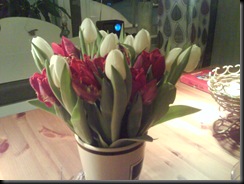 Idag fick jag besök av en väninna och det var väntat eftersom hon sagt att hon ska komma och hälsa på, men oväntat därför att det tagit en stund. Ska dock tillägga att det verkligen inte är bättre på den här fronten då vi varit på väg MINST lika länge. Det var i alla fall jättetrevligt och ett skönt avbrott i min vardag. Hon kom dessutom hit med en stor bukett härliga tulpaner så nu kan vi njuta av dem varje dag! Älskar verkligen tulpaner, det känns så härligt vårigt!